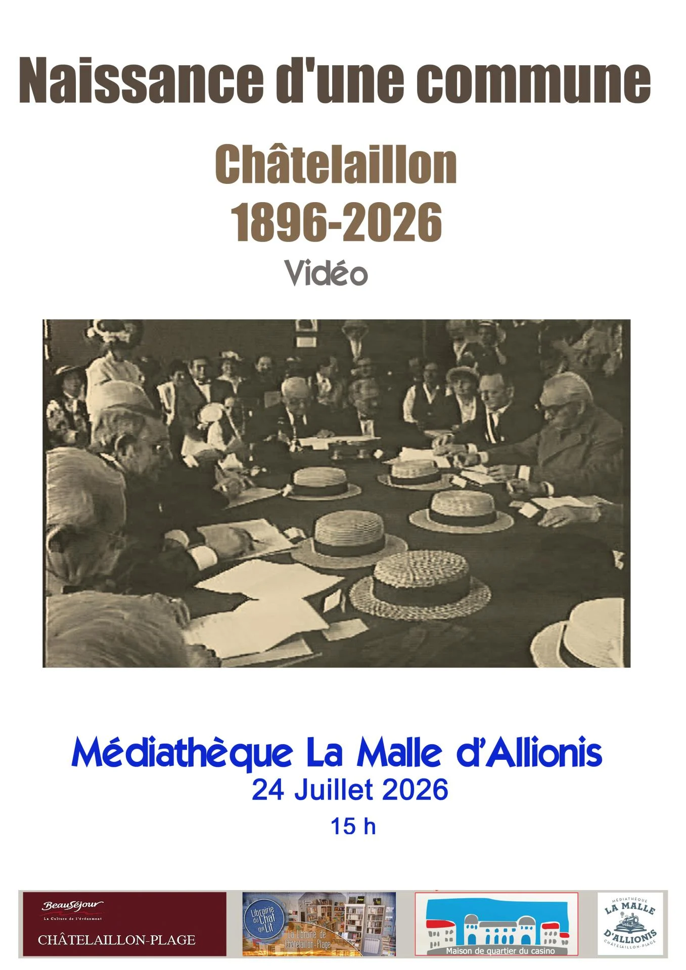 La mairie prête à nouveau son cadre lors des fêtes du centenaire pour un événement qui la concerne au premier chef. La reconstitution du premier conseil municipal du 23 janvier 1897 apparaît comme la référence historique fondatrice de la nouvelle commune de Châtelaillon. Dans les locaux de la mairie, il faut donner à cet événement la solennité requise. On réunit les douze plus anciens conseillers municipaux pour incarner cette évocation du premier conseil municipal de Châtelaillon. Là encore, costumes d'époque de rigueur, les canotiers sont posés sur la table du conseil et les membres de ce conseil reconstitué se consacrent à la lecture des décisions à prendre. Rien n'a été laissé au hasard et le scénario est écrit avec précision. Énonce des textes, discussion, tout se passe dans une salle qui refuse du monde et dans une ambiance fiévreuse rendant difficilement audible les échanges des participants.